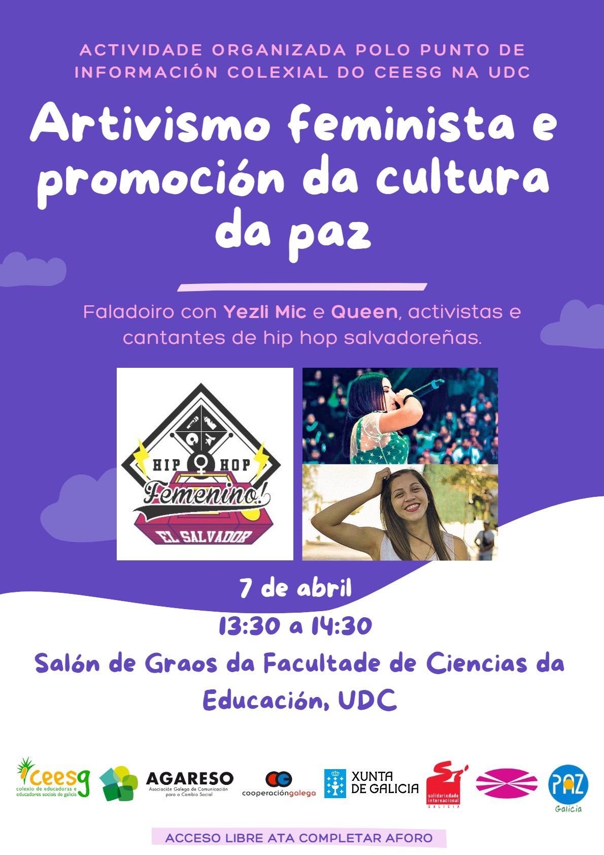O activismo feminista do Salvador vertebra un movemento de oposición, para a despenalización do aborto, que abrangue dende a loita legal para a defensa das mulleres privadas de liberdade até accións de sensibilización. Entre estas voces disidentes e reivindicativas destacan, entre outras, as músicas QUEEN e YEZLI MIC, que na súa estancia en Galicia farán unha parada na Facultade de Ciencias da Educación da Universidade da Coruña, para achegar ao alumnado de Educación Social e a calquera outra persoa interesada, a súa visión e experiencia.